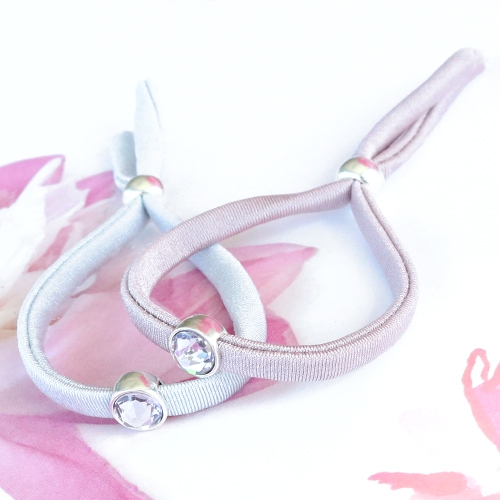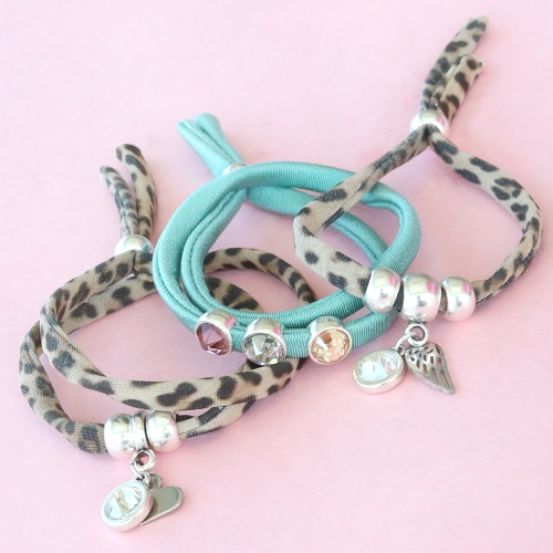 With the new stitched elastic Ibiza ribbon you can easily design bracelets which you can also use as a hair tie. The bracelets are perfect to combine with Designer Quality metal jewellery findings like slider settings for cabochons. The sliders are filled with a pretty Polaris Elements cabochon or Swarovski flatback. As you might have notices, the options are endless with these stitched elastic Ibiza ribbons!