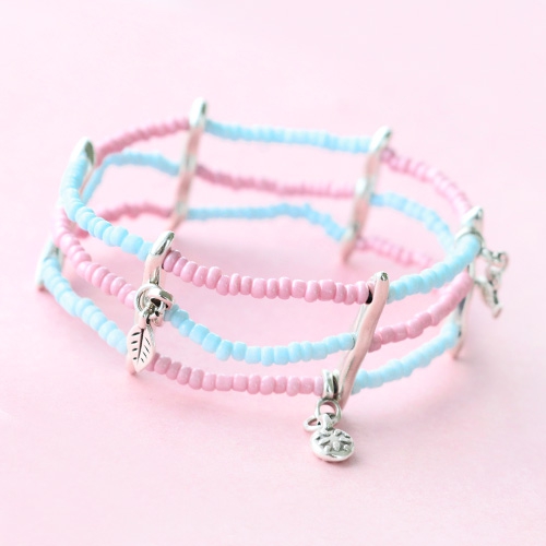 To many bracelets? There is no such thing! We didn’t have to think twice when these charms arrived at the office. We designed bracelets with macramé cord, with which we used multiple braiding techniques. Other bracelets were made with the small glass seed beads in light, fresh colours. We added as many charms as possible to these bracelets. Other bracelets are made with 5 mm Designer Quality European leather and finished with new DQ European metal sliders. To finish off the set you could add some extra earrings!