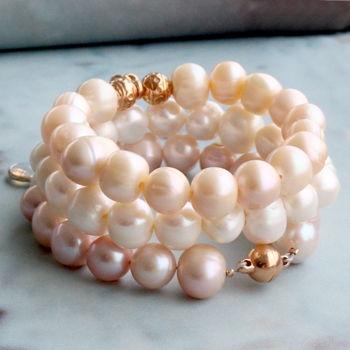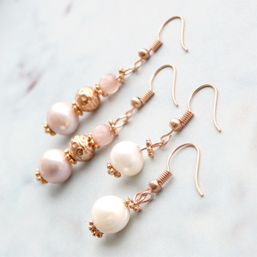 With freshwater pearls you can create beautiful jewellery. We made a classy bracelet with these freshwater pearls. Two bracelets are threaded on elastic bead cord and one bracelet is threaded on metal wire. The magnetic DQ metal clasp makes the bracelet look very luxurious. Besides the bracelet we also made some nice earrings with these classy freshwater pearls. In our set we used DQ metal beads and findings in a rose golden colour, this makes the freshwater pearls really stand out.