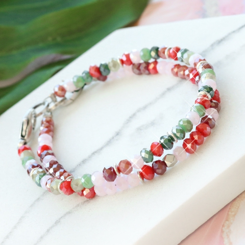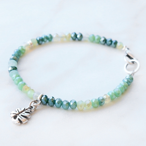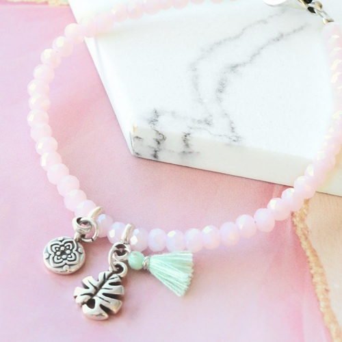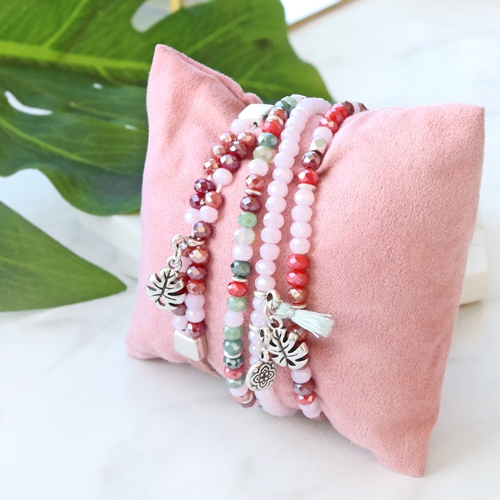 Colourful and minimalistic jewellery designed with faceted beads. With the new summer proof faceted beads collection for example! Combine green, pink and red shades with each other for a surprising effect. De bracelets are threaded on metal wire and finished off with DQ European metal and small tassels, attached to a pendant with eye.