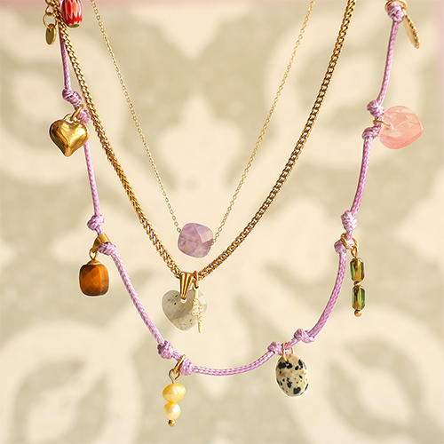 This new collection of natural stone charms is available in various shapes and beautiful colours. The charms are perfect for stacking necklaces. Combine beautifully with braided macramé wire, colourful pearls and various beads.
