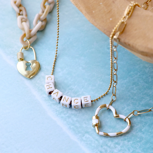 With the zirconia lock charms, you can make stylish and tough jewellery with a wow factor! You can implement the zirconia locks in various ways, both as charms and as connectors. Create different necklaces by hanging the zirconia locks on a belcher chain or the popular acrylic chains. Give the item an extra trendy look by shoving initial charms on the zirconia lock. For an elegant look, you can combine the zirconia locks with freshwater pearls. You can also choose to personalize the pearls with the zirconia brass elements. Herewith, you create an eye-catching zirconia jewellery piece. Would you like to make a set? Then think about making a belcher chain necklace with cube letter beads. Get started and create stunning statement jewellery pieces!
