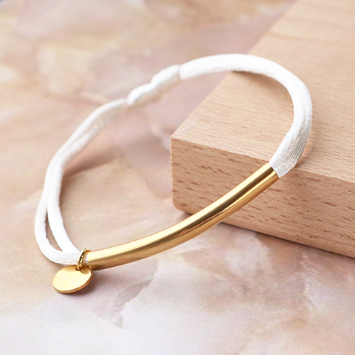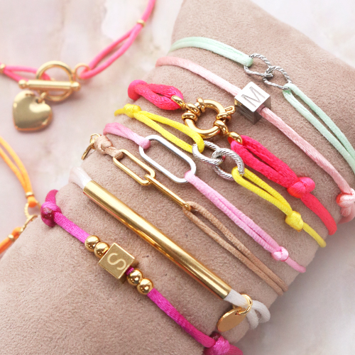 It’s time for a new inspiration set! Therefore, we started working with satin wire and stainless steel connectors to make trendy bracelets. Start by choosing your favourite colour satin wire. Then loop the satin wire on both sides through the connector. To be assured that the connector is staying in the correct place, you can thread stainless steel crimp beads on each side. Afterwards, you close the bracelet with a sliding knot. In addition, you can make use of a goggle clasp for alternating clasp types. The bracelets are easy to put together in various ways, with stainless steel jewellery findings as beads, charms and letter beads. Combine the items with a bracelet of glass seed beads, freshwater pearls and a stainless steel belcher chain bracelet for a playful effect.