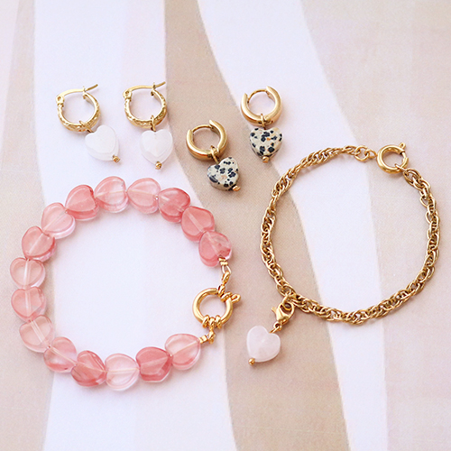 We love the new collection of natural stone beads! Therefore, we started to design colourful jewellery. In this inspiration set, we have combined the heart and star natural stones, with various gold-coloured stainless steel jewellery findings. What do you need to make these trendy earrings? A stainless steel earring finding, a headpin, a stainless steel bead, a pair of round nose pliers, and of course, your favourite natural stone bead. Shove the beads onto the headpin and bend an eye with a pair of round nose pliers. Attach the charm to the earring finding and you’re ready to go! Combine multiple natural stone beads with a stainless steel toggle clasp for an eye-catching bracelet. To complete the look, you can create a necklace with a stainless steel belcher chain, an eyepin and a natural stone bead. Have fun and create stunning jewellery!