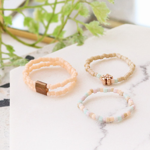 These Miyuki rings and bracelets can be adjusted by the seasons by switching things up with trend colours. The design itself is timeless! Use multiple colour combinations and string the bedas by using a pattern or in a random order. For making these cute rings we used Miyuki seed beads in 11/0 and 15/0. For making the bracelets we used Miyuki tila and delica beads as well. These bracelets are a little less minimalist but finish up your collection!
