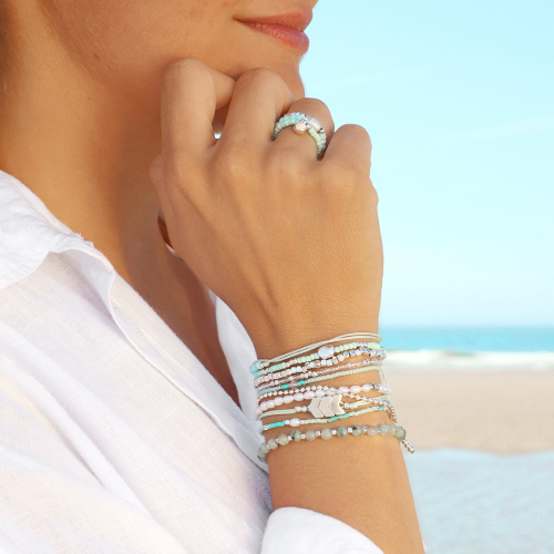 By using mini beads and jump rings, you can easily make super elegant bracelets, necklaces, rings and ankle bracelets. You can obtain an extra stylish result by wearing multiple bracelets at the same time. Alternate different sorts, sizes and colours of mini beads to create endless combinations. Don’t be afraid to vary Miyuki delica beads with mini pearls, natural stone beads and faceted beads. Create an eyecatcher in the middle of the bracelet by stringing one big bead amongst the mini beads.To finish your bracelet, choose a nice clasp that you attach with a DQ metal jump ring. You can realise a beautiful bracelet by combining mini beads with macramé bead cord. Fix the beads by using crimp beads on both sides and finish with a sliding knot. To make rings, you best use an elastic cord.