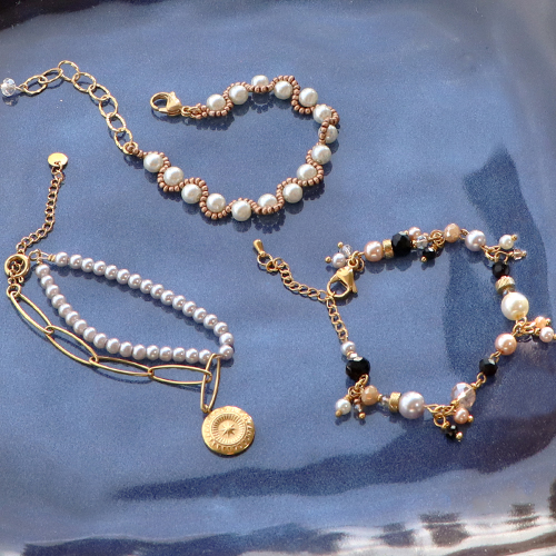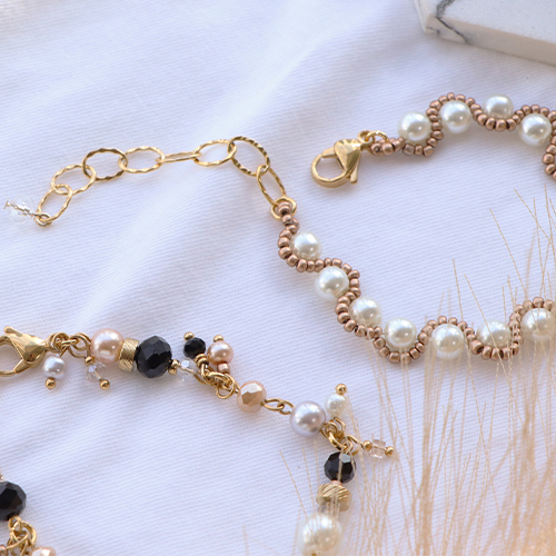 Are you also fond of glass pearls? Make a magnificent bracelet by stringing a beautiful big bead onto an eyepin and by creating a second eye on the other side. Create several of these connectors that you connect with jump rings. Attach smaller beads that you transformed into a charm using a headpin, onto the jump rings. Or create earrings with glass pearls in four different sizes, Miyuki beading wire and glass seed beads. You can use the same pattern to create a bracelet or a necklace by using glass pearls in one and the same size.