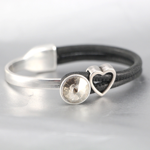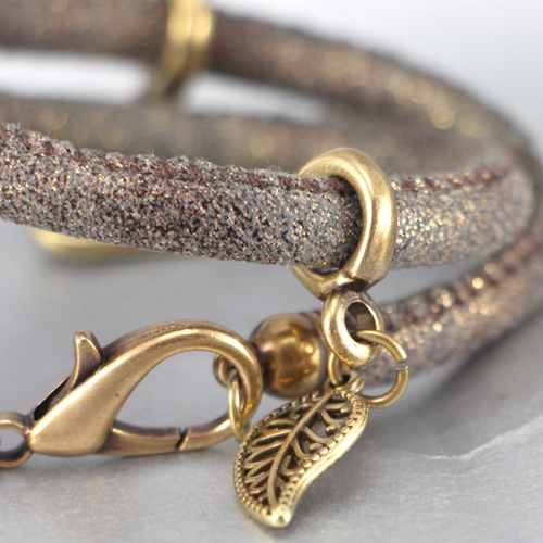 These beautiful bracelets are made of stitched faux leather and DQ metal charms and findings. The little glitters in the faux stitched leather combine perfectly with the DQ metal colours. Our basic bracelets for the 1122 Rivoli chaton are fun to mix with this faux leather. Choose fun colours and trendy sliders to make a nice bracelet with a shiny chaton as a finishing touch. We always have trendy new charms in our collection, they are absolutely perfect to mix with this cool leather. Use DQ metal charms in combination with a jumpring and connect them to a ring with an eye that you can slide around the leather. This look is totally hot at the moment!