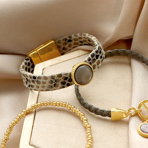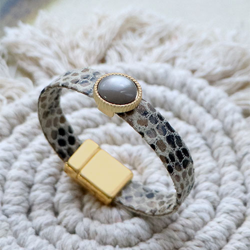 With these fun items you can easily create elegant bracelets. Use for example DQ leather and string some beautiful DQ beads to make a double bracelet. Tuck the ends away in end caps and use an extension chain on the clasp. Or glue a cabochon in a matching setting and slide it over the snake print leather. You can use the same leather to create a trendy phone cord.
