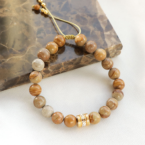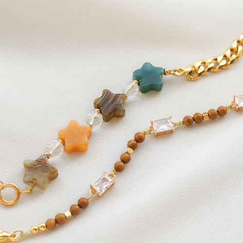 This collection of natural stone beads can be used to design a beautiful range of different bracelets. Choose different stringing materials such as macramé bead cord, elastic thread or jasseron chain. A possibility is to combine the natural stone beads with faceted natural stone beads, natural stone tube beads and DQ metal beads. Wear these bracelets together with a ready-to-wear bracelet such as a Polaris Steel bangle bracelet with a cabochon.