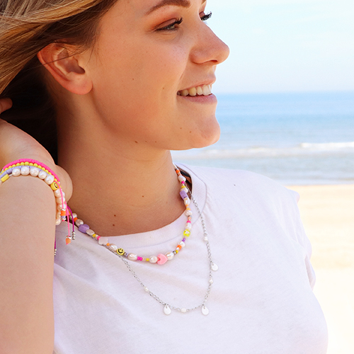 With various colours of Katsuki disc beads, a cowrie shell charm and a macramé bead cord, you can easily create a cheerful piece of jewellery. Combine different shell beads such as ocean bamboo beads, shell beads, and freshwater pearls to give the jewellery an extra summery appearance. Design a trendy bracelet by composing shell items and glass seed beads. The fun polymer beads fit the theme of cheerful jewellery perfectly. Wear the colourful bracelets and necklaces with silver stainless steel ready-made jewellery for a must-have summer look!