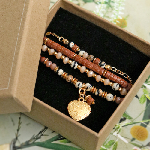 Be inspired and get started with the latest natural stone beads! This time we started working with natural stone beads and Artistic Wire. For example, create a bracelet or earrings by wrapping the wire around the natural stone beads. To make this bracelet you start with a long piece of Artistic Wire which you bend twice. With the bend you get you can make the eye. From then on you thread the beads over the wire and wrap the other end around the wire and the beads. When you're done you can also bend a hook with the wire so you immediately have a matching clasp. The technique of wrapping the wire can also be very nice in a pair of earrings. Complete the set and combine natural stone beads, DQ European metal beads, top facet beads with each other on for example elastic cord. Good luck