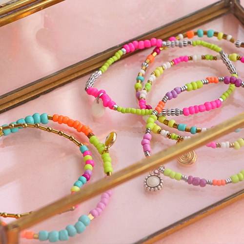 This series of glass seed beads is very popular thanks to the beautiful neon colours; this summer’s big trend! You can create fantastic bracelets using elastic cord and jewellery glue. Use glass seed beads in different sizes and combine those with hematite beads to create a fun necklace. To create sunglasses cords, you can use macramé bead cord. String beads onto 1 macramé cord, then twist several cords until reaching the required length.