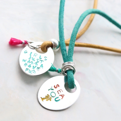 With the latest ImpressArt arrivals you can personalise the most cheerful jewellery and colour your ImpressArt print with new Vintaj Patina. You can also use Vintaj Patina in combination with other metal, like DQ European metal and TQ metal beads and charms. Combine the metal with pompoms, tassels and DQ European leather in summer colours! Add Vintaj Patina to your metal with a small tassel.