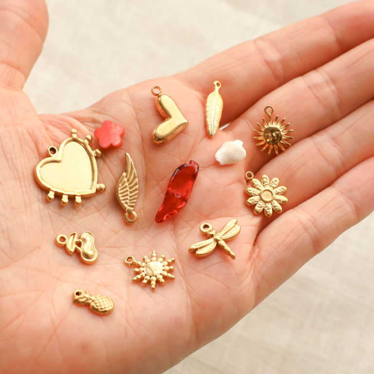 Have you spotted our new collection of stainless steel charms yet? You shop them in various fun shapes, such as flowers, animals and hearts. This series is perfect for creating pretty charm necklaces in a layered look or hanging the charms on creole earrings for trendy earrings.