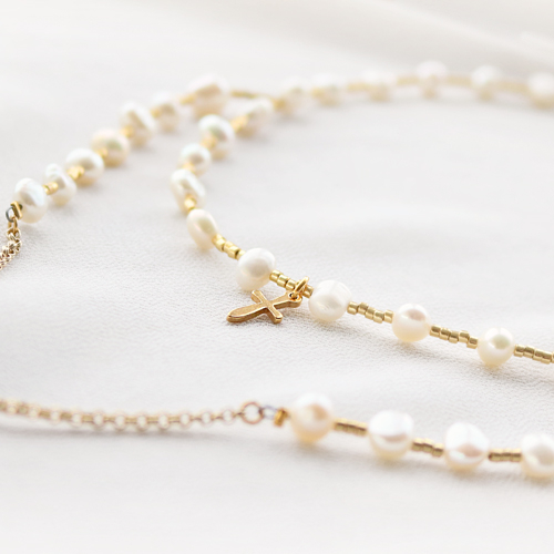 Jewellery is often a symbol for something or someone. By adding religious symbols to your jewellery you can strengthen that. To inspire you we have created a beautiful set of jewellery that proves that trendy and symbolism go well together. The gold coloured DQ European metal charms together with freshwater pearls give a fantastic effect. You can also use these parts to make a beautiful rosary necklace or bracelets with religious charms
