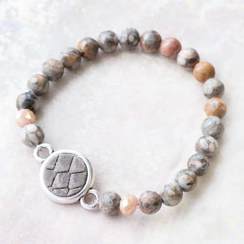 Inspired by nature! When we were designing this set of jewellery, we were inspired by natural shades with a light and summery effect. We used natural stone beads and semi-precious stone beads & genuine DQ European leather. We combined them with faceted beads and DQ European metal charms to give the jewellery a summery look.