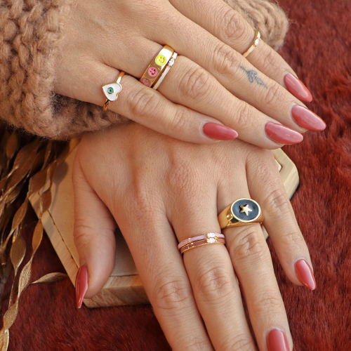Combine these colourful rings and earrings with handmade jewellery