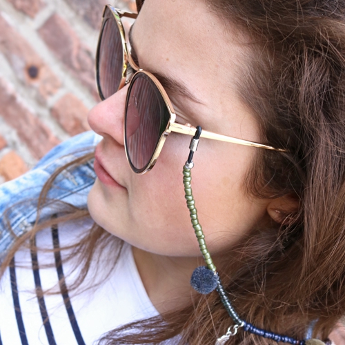 We are totally in love with these sunglasses from our sunglasses collection. Because you don't want to loose your sunglasses we decided to design some glasses cord ends. By creating your own design you can really yourself. Use a necklace of glass seed beads or the faux suede as a basis. Give shape to your design with DQ metal charms, pompom charms and bohemian pendants. Than you can personalize even further for a unique result. In the examples you can see some inspiration for light and dark designs that way you can always create the perfect glasses cord end matching your outfit!