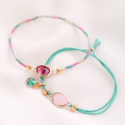 What kind of jewellery makes your customers happy? This jewellery with crystal glass is perfect for anyone! We combined crystal glass with multiple stringing materials like macramé bead cord and belcher chain. We also used our Miyuki delica beads in the latest trend colours, a cheerful detail in this arm-party. To finish the look we also designed matching earrings with earring findings of Designer Quality European metal.