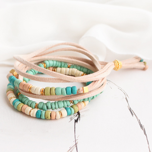 With coconut beads you make jewellery with a natural look and a bohemian feeling. Thread the different colours of coconut beads on elastic and alternate this with the DQ European metal beads for a playful effect in the bracelets. You can also thread the beads on a eyepin and use the centerpiece in a wrap bracelet with imi suede cord. Earrings with coconut beads are also super fun to make. Hang your charm, for example in the shape of a half circle on the earring finding. You can wrap the coconut beads with Artistic Wire. Another tip is to thread the beads over a creole. Hang your favourite charm in the middle and glue a cabochon on the earring studs. Good luck!