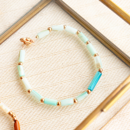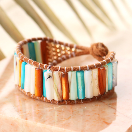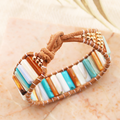 When making this summer jewellery, the tube shell beads where the center of attention. These beautiful beads come in different colours, each with a beautiful pearl shine which gives your jewellery an extra shiny effect. The shell beads can be used when making trendy bracelets. Thread the shell beads together with DQ European metal beads on metal wire and attach a clasp at the end. Give an extra touch to the bracelet by attaching a kauri shell or a nice DQ European metal charm in the middle. DQ European leather and shell beads are also a beautiful combination. Take two pieces of leather and attach the tube shell beads in between, these beads are secured with stringing wire. This bracelet closes with a knot and a loop in the leather. Good luck!