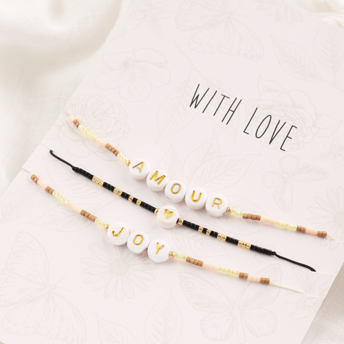 Are you completely in love with those cute minimalist bracelets with beads? Shop the latest trendy Miyuki bracelets with letter beads now. These bracelets are made of macramé bead cord, Miyuki beads and letter beads. Each bracelet has a sliding macramé button. This allows you to adjust the size of the bracelets. The bracelets each have their own text with letter beads and they are available in two different colours. Tip: they are also very nice to combine with other bracelets or to present/gift them on a jewellery card.