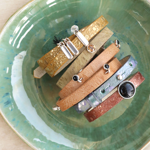 Are you looking for inspiration to design a stylish bracelet collection? Get ready to work with these Cuoio bracelets and matching sliders and cabochons. You can also choose to use a rivet from the Swarovski Elements collection. Make sure to use a soft surface when you place the rivet with your Swarovski cabochon in the bracelet to avoid damaging the stone. If you want to fix a charm or a belcher chain, make two small holes next to each other with hole punch pliers. Open a jump ring, slide it through the holes and close it again. You can fix your charm or belcher chain on the jump ring!