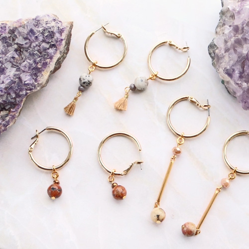 Shop our new collection sharp priced natural stone beads and create the most amazing ornaments! We’ve made different bracelets and earrings with these pretty beads and here you’ll read exactly what you need… Combine the natural stone beads with DQ European metal earrings and connectors for a surprising contrast. Also use DQ European metal beads when making the bracelets and vary the natural stone beads with acrylic beads and top faceted beads. At last you can decorate your jewellery with, for example, tassels for a playful effect. Good luck!